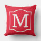 Na moda e travesseiro clássico de ênfase exterior quadrado apresenta uma inicial de monograma com uma simples estrutura decorativa em cor branca com cor vermelha de fundo. Personalize o plano de fundo para coordenar com a decoração exterior.