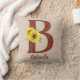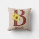 O travesseiro bonito apresenta a letra de madeira vermelha rústica e decorada / a letra inicial B tem um embelezamento de buquê de girassol sobre fundo de burlap.