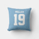 Add a name and number(s) to personalize this custom double-sided light blue and white sports jersey inspired accent pillow. It is an excellent gift for a sports fan or athlete. The options to change the color and font sizes are available.