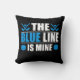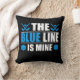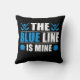 O travesseiro da Linha Azul de Hockey apresenta pincéis azuis e bastões de hóquei com texto branco e azul que lê A Linha Azul é Minha.