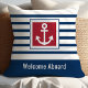 Adicione um toque de charme náutico à sua casa à beira-mar ou cabine de barco com esta almofada personalizada que apresenta listras simples em azul-marinho, uma ilustração de uma âncora e uma paleta de cores clássica em azul-marinho e vermelho. Uma alegre saudação "Bem-vindo a bordo" estende um convite caloroso aos seus convidados. Personalize este design adicionando um nome de família ou outro texto para criar um presente único em estilo marítimo para proprietários de casas à beira-mar ou entusiastas de barcos.