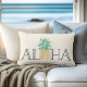 Nosso travesseiro de tipografia tropical em branco quente apresenta a saudação havaiana "Aloha" em caracteres azuis-cinzas escuros, com uma ilustração vintage do abacaxi no lugar do O.