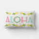 Bem-vindos a nossa casa com um design de travesseiro de estilo tropical que apresenta uma tipografia colorida "Aloha" e uma borda festiva de abacaxi amarelo. Inclui cor rosa claro, azul-aqua, verde-folha, amarelo-sol e branco.