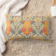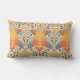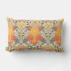 Este travesseiro decorativo retangular tem flores e folhas em tons de amarelo, laranja e cinza azul sobre fundo creme.