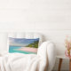 Pillow with a beautiful photograph. A scenic tropical beach with aquamarine water and a white sandy beach with a lush forest in the back.