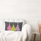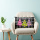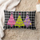 Este travesseiro moderno e colorido apresenta árvores de Natal rosa, roxo e verdes. O fundo é um padrão controlado em preto e cinza.