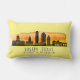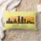 O design decorativo apresenta a silhueta do horizonte de linha do horizonte da cidade de Austin Texas com abertura de cor d'água do pôr do sol em fundo amarelo pálido e coordenadas de latitude e longitude