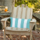 O design na moda para travesseiro exterior apresenta um padrão de extensas faixas verticais de cabana brancas com um fundo azul de aqua / turquesa / azul-lacrimejo. Design clássico com qualquer estilo de decoração. A cor de fundo pode ser modificada.