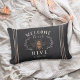 Bem-vindos convidados com este travesseiro decorativo de tema de abelhas bonitinho, com uma ilustração de abelhas do estilo vintage, enfeitada com folhas botânicas e detalhes de cordas. "Bem-vindos à nossa colmeia" aparece em letras de marfim. Personalize com o seu nome de família na parte inferior.