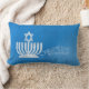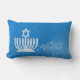 travesseiro decorativo lombar de 21" x 13" com uma imagem de uma menorah pálida azul e branca tocada com uma Estrela de David em tons azuis. Azul resmungar. Consulte travesseiro de destaque de 12" x 16". Veja toda a coleção de Travesseiros Chanucá sob a categoria HOME na seção HOLIDAYS.