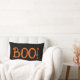 O plano de fundo apresenta uma cor sólida preta personalizável. Travesseiro lombar do tema do Halloween para o seu decor de outubro. Você pode personalizar a tipografia boney "BOO!".