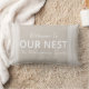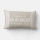 Seu ninho é sempre o melhor! Este travesseiro pequeno bonito iluminará todo o espaço com sua mensagem do coziness. Caracteriza um fundo claro do taupe com as palavras "boa vinda a NOSSO NINHO" assim como seu nome de família personalizado embaixo no branco. Os lados têm um design das listras do creme claro.