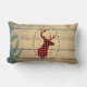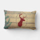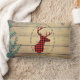 Um travesseiro lombar com estilo rústico. Projetado com uma cabeça de veado com galhadas, feito de xadrez vermelha. Um quadro oval de rico envolve a imagem. Uma imagem de planícies de madeira com folhas verdes de marfim ao fundo dá-lhe uma sensação de campo ao ar livre.