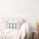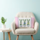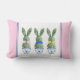 Esta almofada de Páscoa apresenta adoráveis topiárias verdes de coelho com laços rosa, azul e amarelo em vasos de flores de chinoiserie azul e branco.