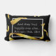 O design wedding elegante, personalizado da decoração da casa do travesseiro da data no preto e o ouro lêem "e viveu feliz sempre" em seguida com a data wedding personalizada nas letras brancas em preto adiciona a inicial do monograma, nome personalizado, data, todo o texto que feito sob encomenda você desejar. Quadro pelo esboço branco com as fitas metálicas do ouro do falso dispersado, festivo. Presente de casamento original e pensativo ou presente do aniversário que os noivos amarão.