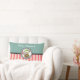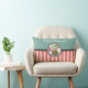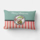 Um travesseiro com um elfo de Natal giro numa roupa verde festiva segurando-a numa bengala vermelha e branca listrada. Feliz Natal escrito em uma moda manuscrita. O fundo é um verde pastel com um padrão listrado vermelho ao longo do fundo.
