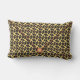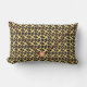 A arte original de ZoeSPEAK neste Travesseiro lombar é um padrão feito no estilo de um saco de embraiagem de envelope. O saco é uma gaiola de latência dourada, revestida com um tecido de seda preto azul escuro, que tem um padrão sutil de linhas circulares e destaca em azul, vermelho e verde. Há pequenas bolas vermelhas nos espaços abertos da lata. O flap do envelope tem uma borda vermelha e um grande botão vermelho de bola fechando sob a estrutura dourada.