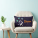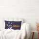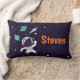 Um travesseiro lombar personalizado com um fundo azul escuro com estrelas amarelas espalhadas ao redor. Camadas sobre o topo é uma ilustração de um espaçador vestindo um traje astronauta branco flutuando no espaço. À distância estão planetas com anéis e um foguete a explodir em lugares desconhecidos.