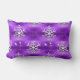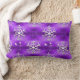 Um travesseiro lombar (ou almofada) festivo e elegante, roxo, de Natal, com um padrão decorativo de grandes flocos de neve prateados e pequenas estrelas brancas e faíscas sobre fundo roxo.