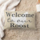Bonito travesseiro decorativo rústico com uma silhueta branca de galinha e as palavras "bem-vindo ao nosso rastro" em texto de cinza média. O backside apresenta o nome da sua família personalizada.