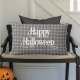 Este travesseiro de Halloween apresenta uma xadrez clássica, marcada por tartan, em cinza e branco com as palavras "Feliz Dia das Bruxas" em um roteiro decorativo branco e ousado.