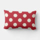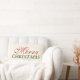 O travesseiro decorativo sazonal apresenta um design de texto de Natal feliz moderno em cores clássicas, vermelhas e verdes, com um fundo de marfim branco suave/leve. Um padrão de bolinhas grande se veste na parte de trás do travesseiro.