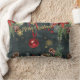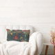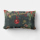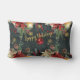 Um travesseiro decorativo de decoração de Natal de inverno que apresenta um fundo noturno de floresta florestal de floresta com flocos de neve de ouro, poinsetos, lanternas, pinos cones e bagas vermelhas com um ornamento de bola vermelha em fita vermelha caindo com Feliz Natal e Feliz Natal em um piscadinho de ouro cintilante na frente e no verso. Os lados frontal e traseiro são cortados de forma diferente.