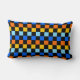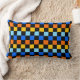 A vibrant checkerboard pattern featuring alternating rows of orange, yellow, light blue, and blue squares against a black background. The design is bold and energetic.