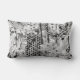 Este travesseiro decorativo apresenta um abstrato eclético que inclui círculos de listras-zebra. As cores variam de cinza (ou cinza) a carvão vegetal a preto.