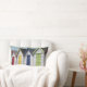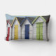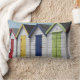 Ideal para uma casa com tema litorâneo, este travesseiro encantador apresenta cabanas de praia tradicionais, de madeira e coloridas. São de madeira, branca pintada com portas em vermelho primário, amarelo, azul e verde.