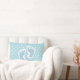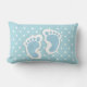 Um travesseiro lombar com uma imagem encantadora das pegadas do bebê azul com um contorno branco pesado. Bolinhas brancas sobre um fundo azul bebê atrás da ilustração.
