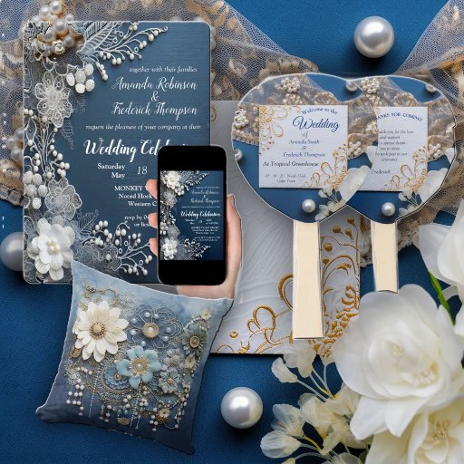 Gráficos de textura Blue Denim decorados com rendas de creme branco e joias de fantasia