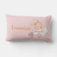 Lindo travesseiro para quarto de bebê ou criança com uma adorável coelhinha bailarina marrom vestindo tutu rosa em um fundo branco com bolinhas. Personalize com o nome da sua criança
