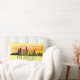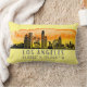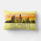 Travesseiro decorativo apresenta silhueta de linha do horizonte da cidade de Los Angeles, Califórnia, com abertura de cor d'água e coordenadas de latitude e longitude em fundo amarelo pálido.