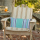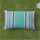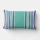 Este travesseiro lombar externo apresenta faixas verticais de várias larguras em turquesa, azul marinho, azul de martamo e branco. Um padrão de verão ideal para pátio ou poolside.