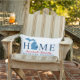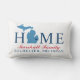 O travesseiro de boas-vindas apresenta o texto "Home" com o mapa do estado de Michigan e o texto personalizado que pode ser personalizado com o seu nome de família e a cidade, indicar onde você mora. O marcador da cidade do coração azul marinho pode ser movido para o local apropriado por meio de Personalizado. As listras horizontais vestem o lado inverso. Cor vermelha, branca, azul e marinho.