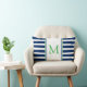 Este travesseiro monograma pré-filmado apresenta faixas marinho náuticas, azuis e brancas, com borda verde. Personalize o monograma azul e verde correspondente com sua escolha inicial. Excelente para o aquecimento doméstico e presentes no dormitório.
