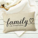 O design de travesseiro decorativo lombar personalizado moderno e na moda apresenta uma tipografia simples e mínima preta "Família" que inclui detalhes florescentes e cardíacos. Personalize o texto em maiúsculas abaixo com um monograma ou ano estabelecido. Um fundo de linho rústico adiciona apelação vintage que complementa a decoração doméstica do estilo de fazenda.