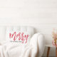 Este design de travesseiro de feriado simplesmente "Feliz" apresenta um design de script escovado vermelho e um texto de nome de família de monograma personalizado moderno em preto suave.