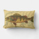 Esta impressão ilustra um quadro artístico de um peixe-perca amarelo. O plano de fundo exibe um mapa geográfico antigo em cores bege claro. A estrutura marrom se assemelha a um padrão antigo de madeira com flores amarelas-vermelhas nas bordas. Um excelente extra para a sua coleção de pesca!