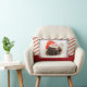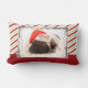 Um travesseiro lombar com uma fotografia adorável de um filhote de cachorro dormindo enquanto veste um chapéu de santa. Feliz Natal está escrito na banda de seu chapéu, com uma letra manuscrita na moda. Uma borda cinza com luzes coloridas de Natal cercando a moldura dessa foto fofinha. O fundo é um padrão festivo listrado de cana doce em branco vermelho e verde.