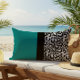 Esta tendência de travesseiro lombar externo apresenta grandes blocos retangulares de cor em verde-lacrimogêneo e uma impressão leopardo-prateada e preta, dividida por um bloco de cor preta mais estreito no centro.