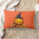 Este travesseiro é um aditivo excelente para a decoração de Halloween. Uma foto de um jack ou lanterna vestindo um chapéu de bruxas. Esta abóbora está no meio de uma cama de folhas de outono. Esta design está num fundo laranja. Um fundo preto está na parte de trás deste travesseiro.
