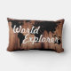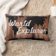 A silhueta do mundo negro, de aparência russa e antiga, mapeia a silhueta sobre um fundo de planks de madeira de celeiro escuro com as palavras "World Explorer" em letras brancas grossas. Este travesseiro decorativo é excelente para um escritório doméstico, biblioteca ou sua cadeira de leitura favorita.
