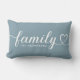 O design de travesseiro decorativo lombar personalizado moderno e na moda apresenta uma tipografia simples e mínima "Família" que inclui detalhes florescentes e cardíacos. Personalize o texto em maiúsculas abaixo com um monograma ou ano estabelecido. As cores azul-ardósia e branca podem ser modificadas.