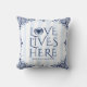 O amor mora aqui travesseiro de casamento. Texto personalizável azul-marinho, ilustração com dois corações, fundo azul-azul-azul-azul-azul-azul-azul-azul-azul-azul-azul-espaginável.