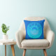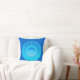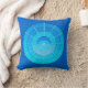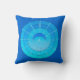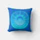 Travesseiro de mandala celestial contemporâneo em gradientes de azul-cerulano, turquesa e aqua, apresentando uma lua crescente e uma explosão de estrelas contra círculos concêntricos