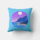 Travesseiro em ilustração circular de uma lua de cheio, costa marítima, colinas e montanhas em tons de azul profundo e violeta