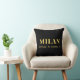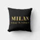 Glam travesseiro decorativo apresenta a cidade de Milão, as coordenadas de latitude e longitude do mapa italiano em fontes douradas sobre fundo preto.