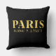 O design de travesseiro decorativo apresenta coordenadas de Paris, França e latitude e longitude no texto dourado sobre fundo preto.